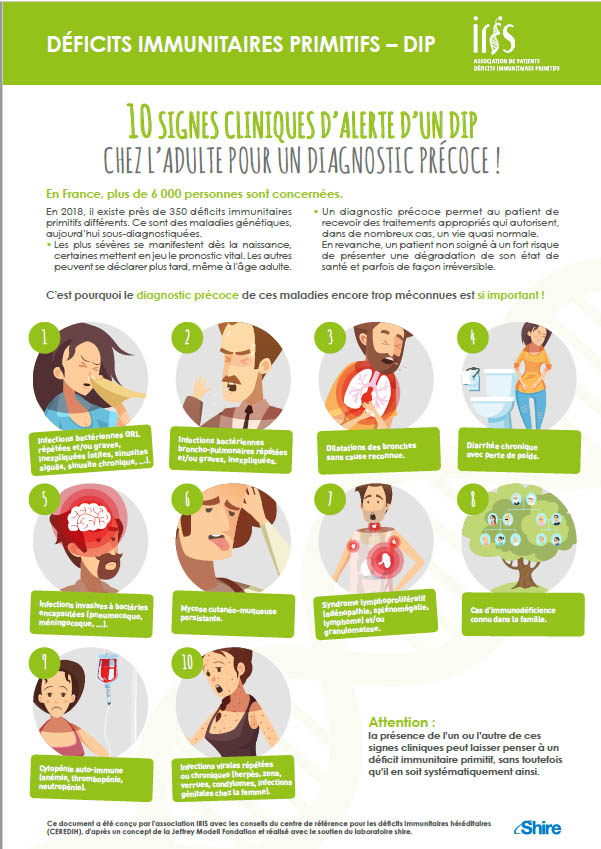 Les déficits immunitaires héréditaires affectent les enfants comme les adultes. Ce sont des maladies génétiques du système immunitaire qui prédisposent aux infections liées à des agents infectieux très variés (banals ou opportunistes) pouvant atteindre différents organes (comme la sphère ORL, le tube digestif, les poumons), mais également à des atteintes auto-immunes (liée à une hyperactivité du système immunitaire), à des allergies, à des syndromes lymphoprolifératifs (augmentation de taille du foie, de la rate et des ganglions) et éventuellement à des cancers.