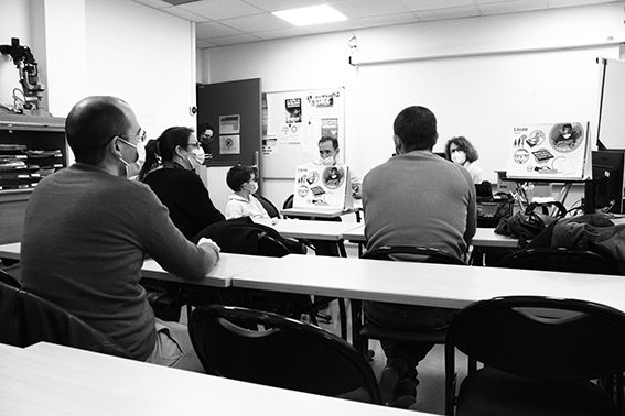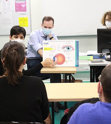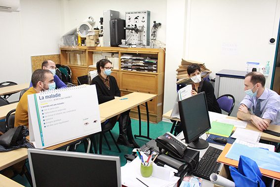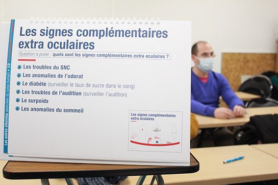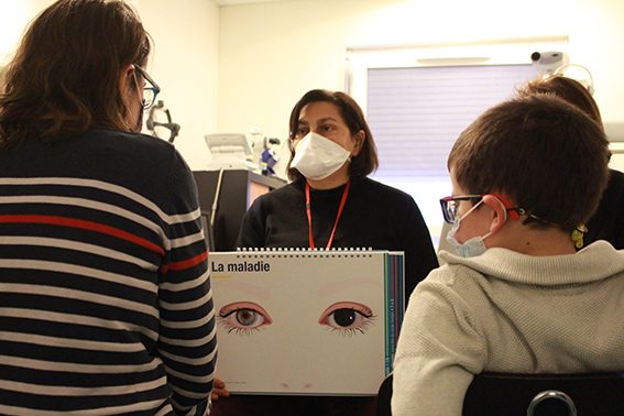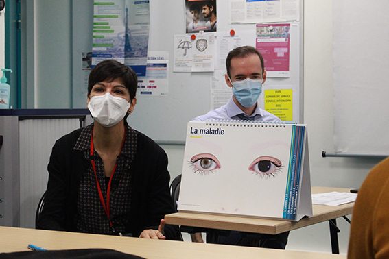 Encadrée par le Pr Dominique Bremond-Gignac (chef du service d’ophtalmologie à Necker), le Pr Matthieu Robert, le Dr Alejandra Daruich-Matet, et accompagnée par Brigitte Garbi (chargée de mission programme d’ETP) et Emmanuelle Kutner (chargée de mission PNDS) ainsi que deux administratrices de l’association Gêniris, Chantal Biger et Gaëlle Jouanjan, cette séance d’éducation thérapeutique a permis à des patients et à leurs familles d’en apprendre plus sur cette maladie génétique rare et sur sa gestion au quotidien.