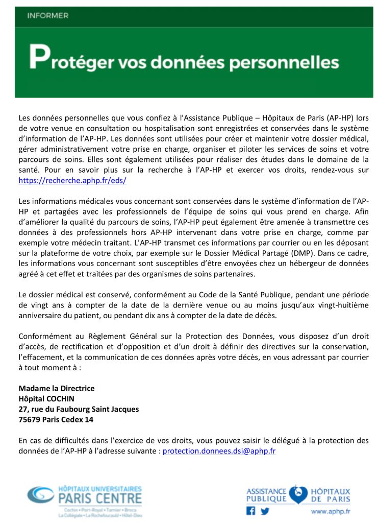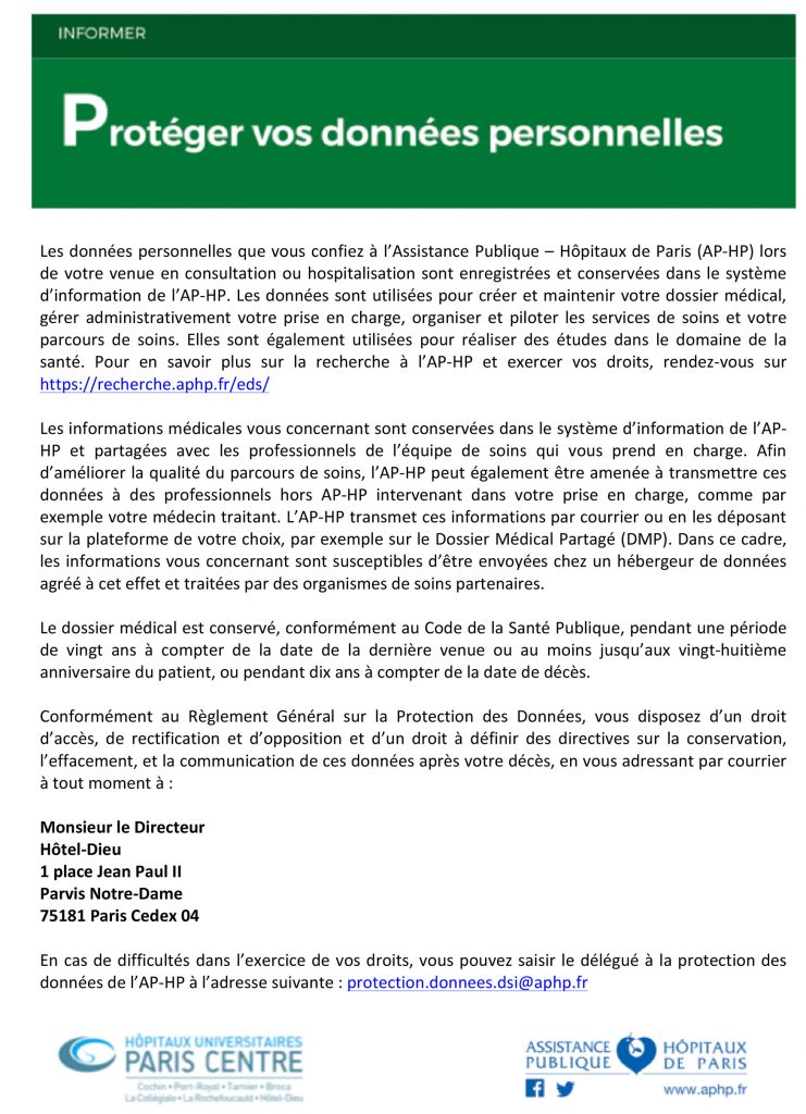 Compte tenu du nombre important de patients concernés, l’impression et la remise des documents d’information aux patients est en cours d’organisation en collaboration avec la direction de la communication et la direction de la qualité, des risques et des usagers.