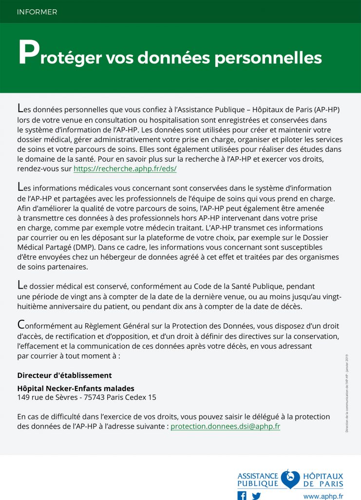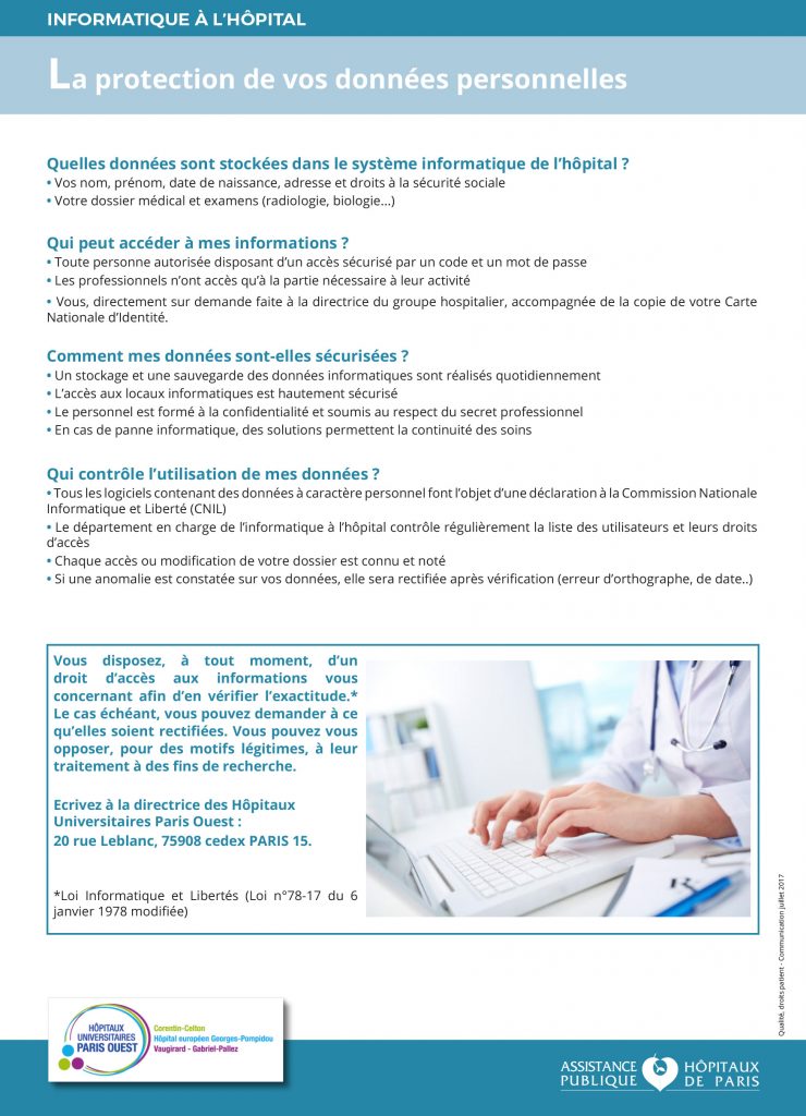 L’affiche réglementaire relative à l’informatisation des données de santé collectées dans le cadre du soin, est apposée dans les supports institutionnels dans tous les services de l’hôpital.