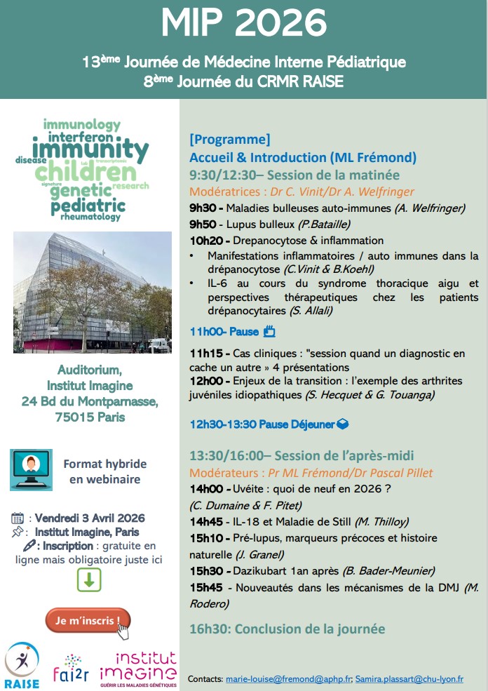 La 13ᵉ Journée de Médecine Interne Pédiatrique (MIP 2026), également 8ᵉ Journée du CRMR RAISE, se tiendra le vendredi 3 avril 2026 à l’Auditorium de l’Institut Imagine (Paris 15ᵉ), en format hybride avec possibilité de participation en webinaire