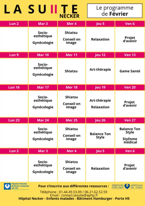 En février, La Suite Necker propose un programme d’ateliers et de consultations dédiés au bien-être et à l’accompagnement des patients suivis à l’hôpital Necker – Enfants malades.