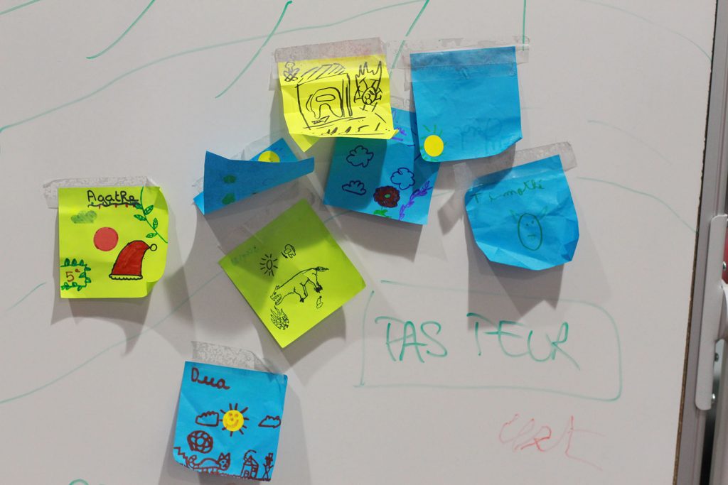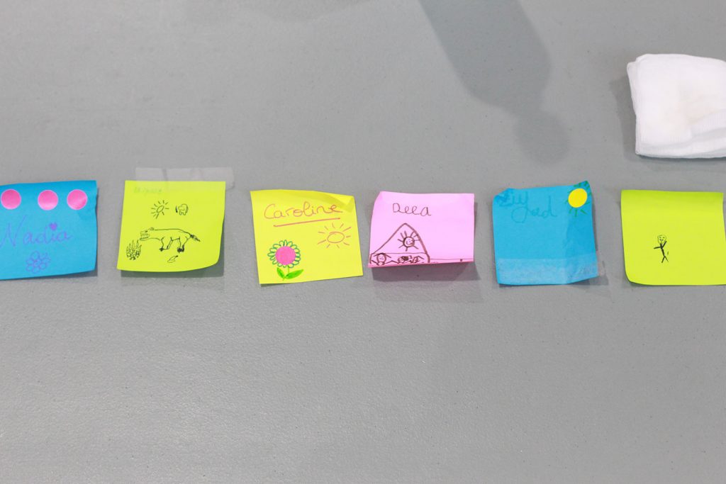 Il est alors temps de passer au jeu des post-its®. Des post-its® sont distribués à chacun des enfants et il leur est ensuite demandé d’y écrire leurs noms et d’y dessiner soit un soleil, soit des nuages en fonction de leur humeur du jour. Ainsi, dès le début, les participants peuvent, de façon ludique, commencer à évoquer les émotions qu’ils rencontrent dans leur quotidien d’enfants confrontés à la maladie. S’ensuit un tour de table où chaque enfant va se présenter et expliquer ce qu’il a dessiné.