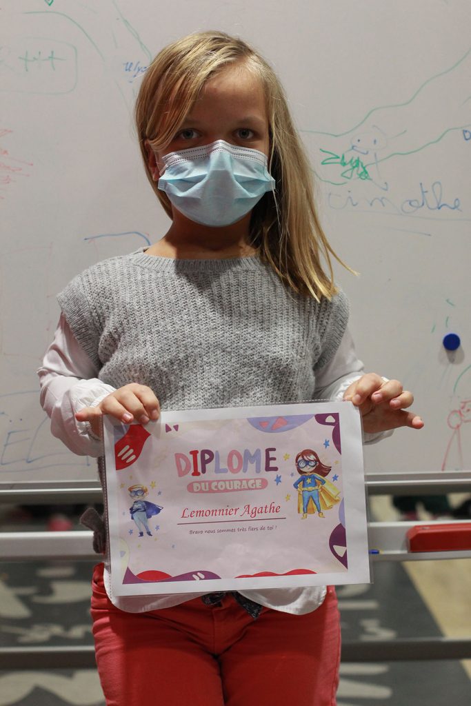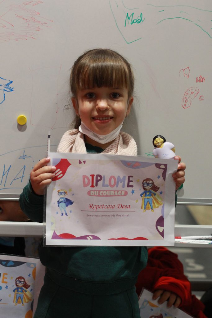 Une fois l’atelier pratique terminé, il est temps de faire le bilan sur cet après-midi d’échange. Les encadrantes dessinent alors une « échelle de la peur » sur le tableau blanc. Tout à gauche du tableau, la zone « J’ai peur » et tout à droite la zone « pas peur du tout ». Chaque enfant est alors invité à déposer un post-it® en fonction de la peur engendrée par le Voxzogo® suite aux différentes discussions de la journée. Et c’est assez naturellement que chacun d’entre eux est venu déposer son post-it® dans la zone « Pas peur », exprimant ainsi les bienfaits provoqués par ces échanges. L’atelier va bientôt prendre fin mais avant cela, chaque participant reçoit un « diplôme du courage » ainsi qu’un petit cadeau venant récompenser leur implication lors de cet atelier. C’est enfin l’heure des retrouvailles avec les parents et du retour dans leurs régions respectives.