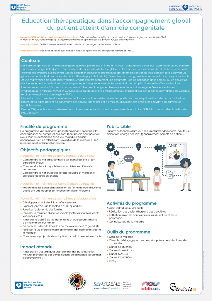 Il existait peu de programmes d’éducation thérapeutique dans les pathologies sensorielles, alors que des besoins avaient été exprimés par les patients. Un questionnaire a ainsi été élaboré avec la participation de l’association Gêniris, pour recenser l’ensemble des besoins et des attentes des patients atteints d’aniridie congénitale. Sur la base des informations recueillies, trois publics ont été identifiés pour participer à un programme d’éducation thérapeutique sur l’aniridie congénitale : les enfants, les adolescents et les parents d’enfants atteints. Ce programme propose donc de nombreux outils pédagogiques adaptés à ces publics. Il a été élaboré conformément aux recommandations de la HAS.